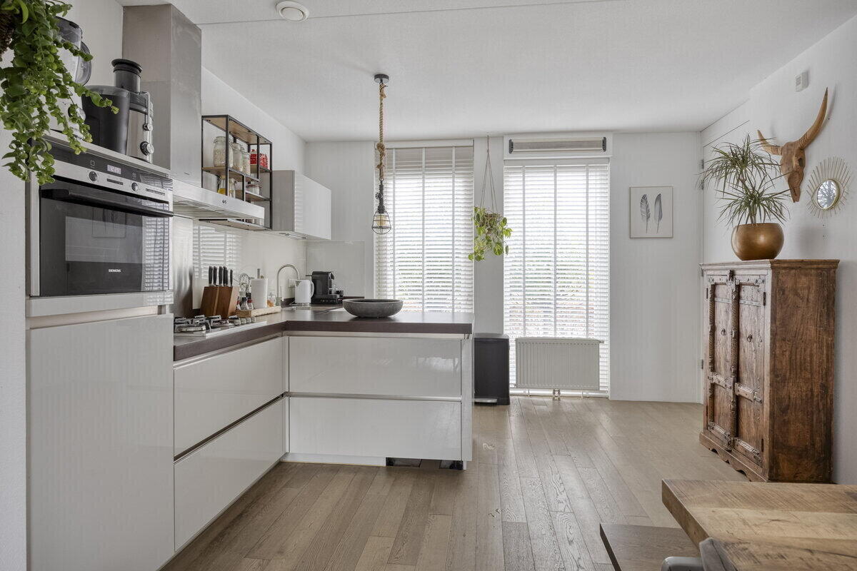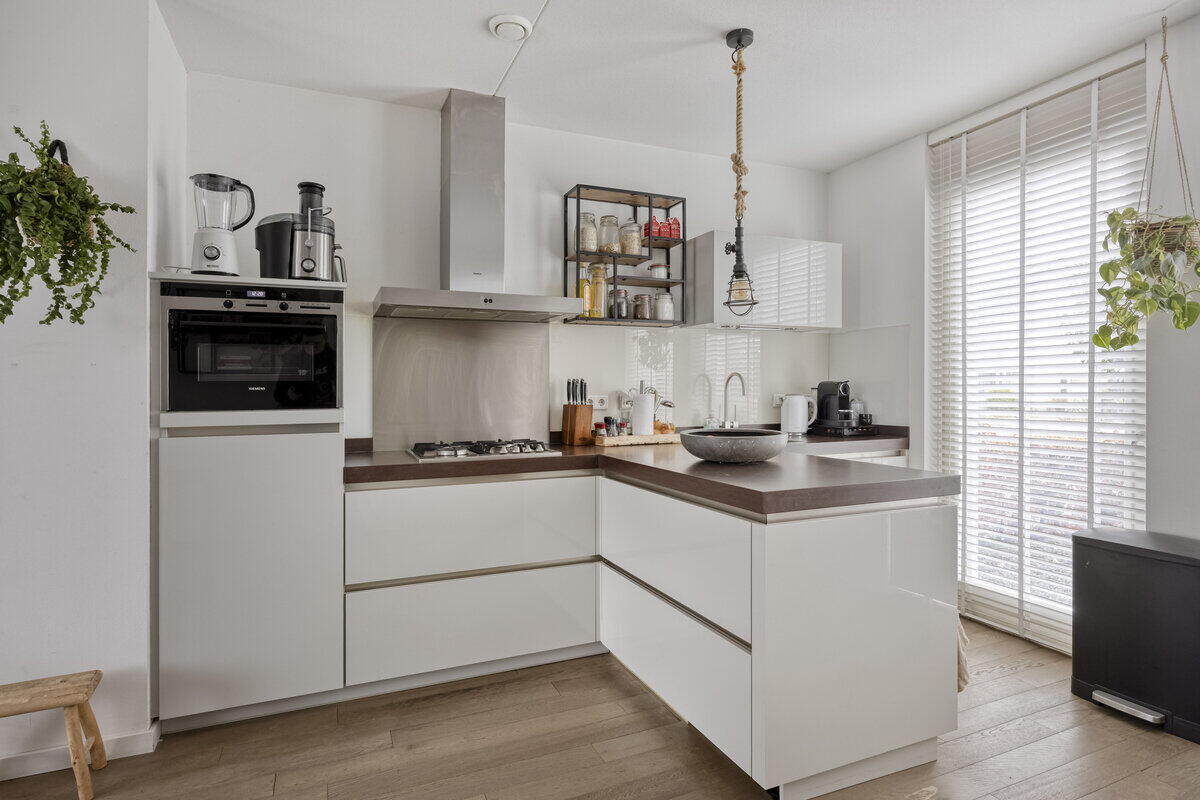 Aan de voorzijde van de woning bevindt zich de open keuken, uitgerust met: