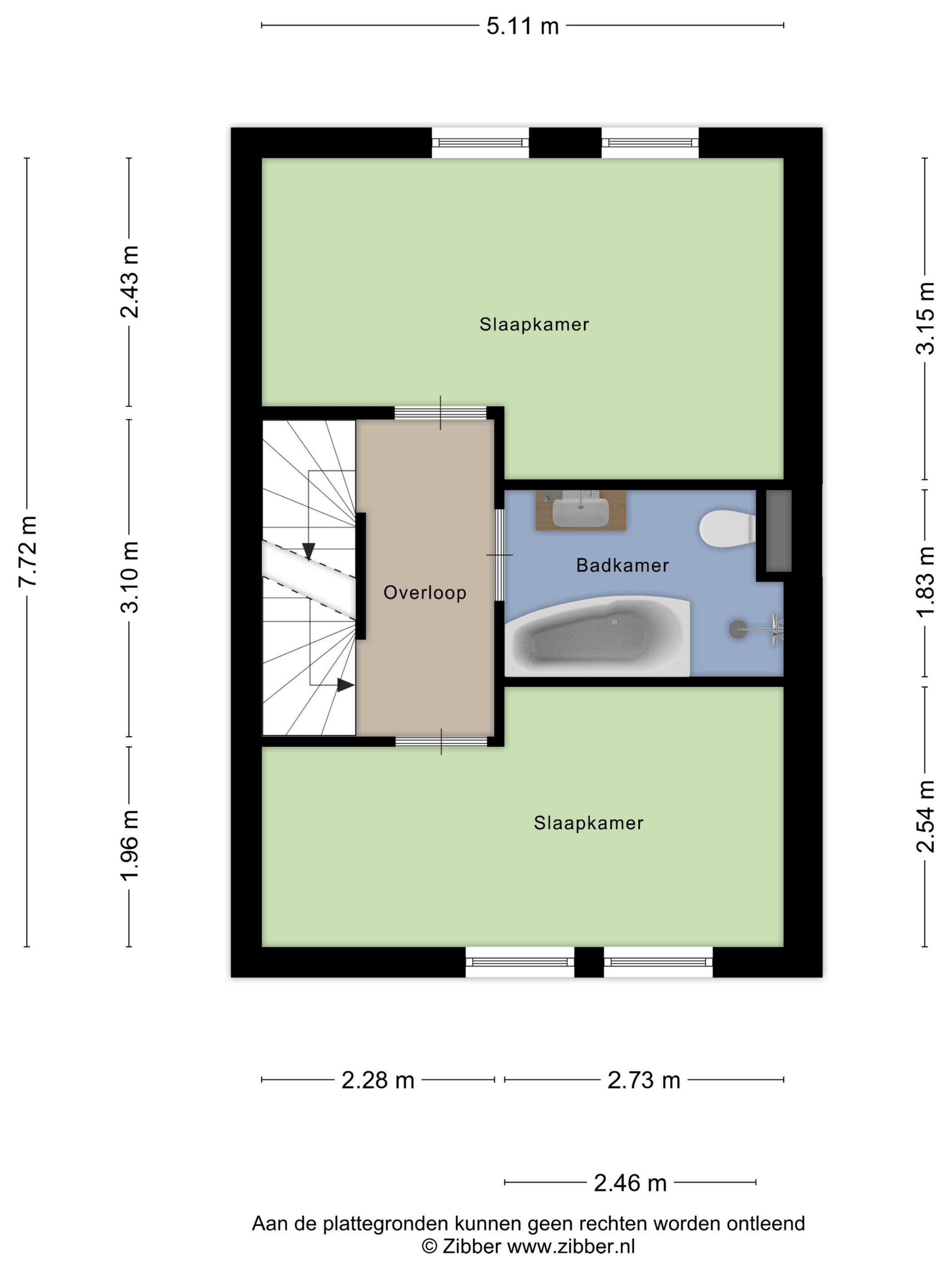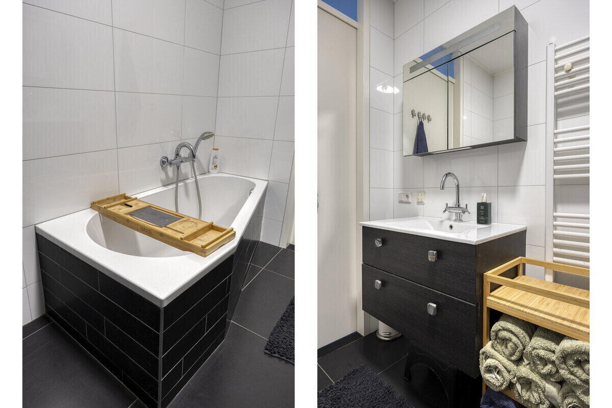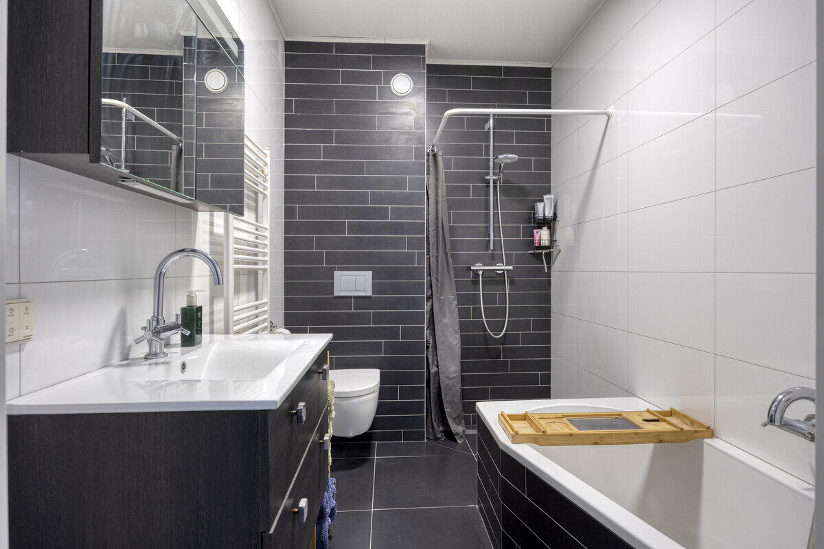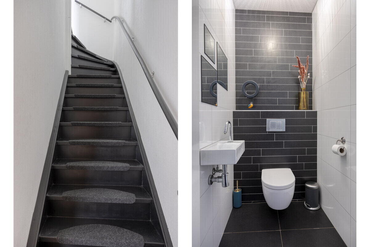 Aansluitend bevindt zich een tussenportaal met een ruime toiletruimte, voorzien van wandcloset en fontein.