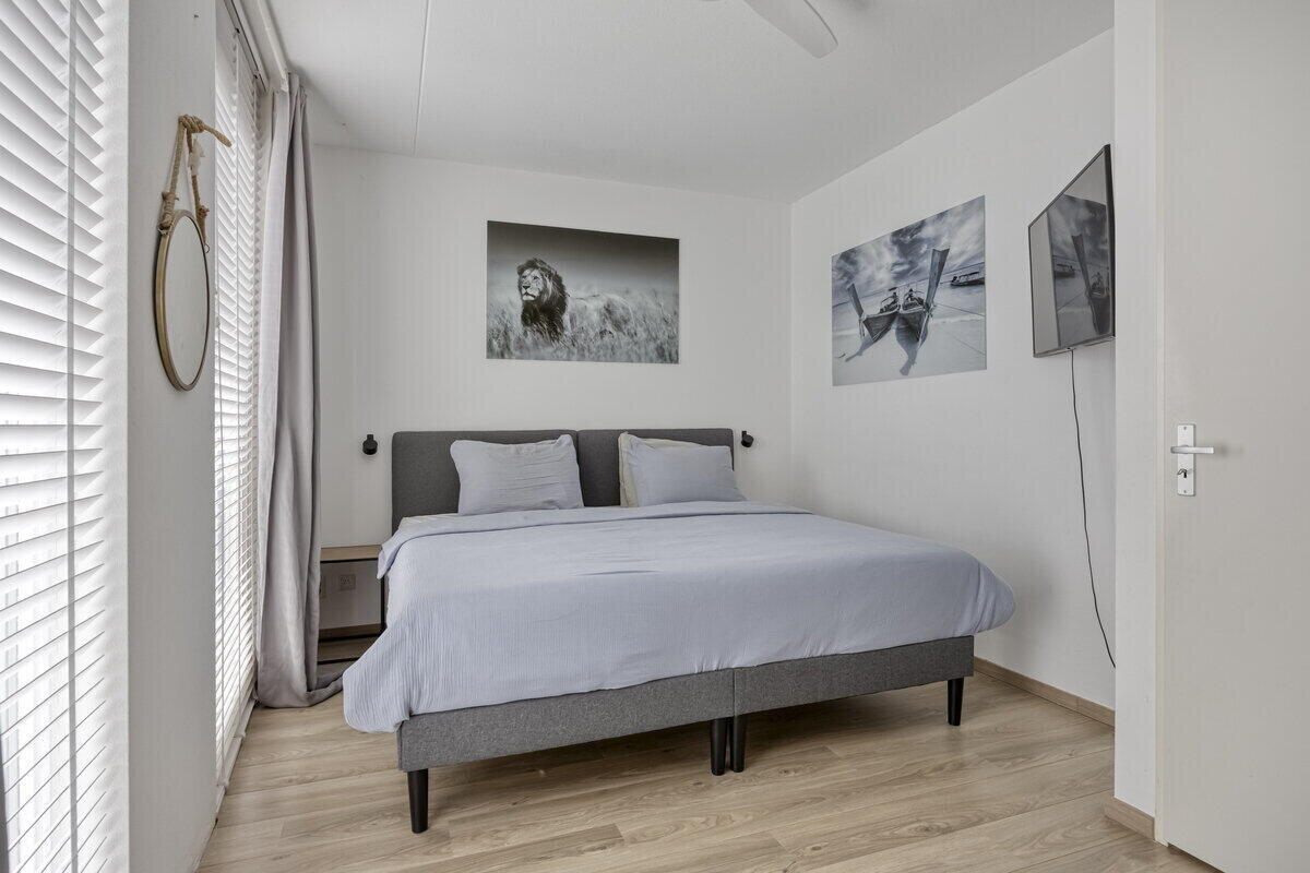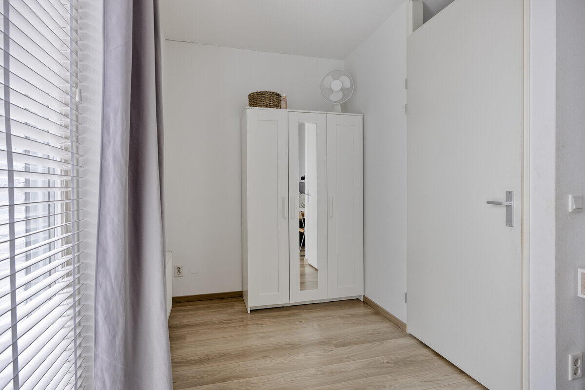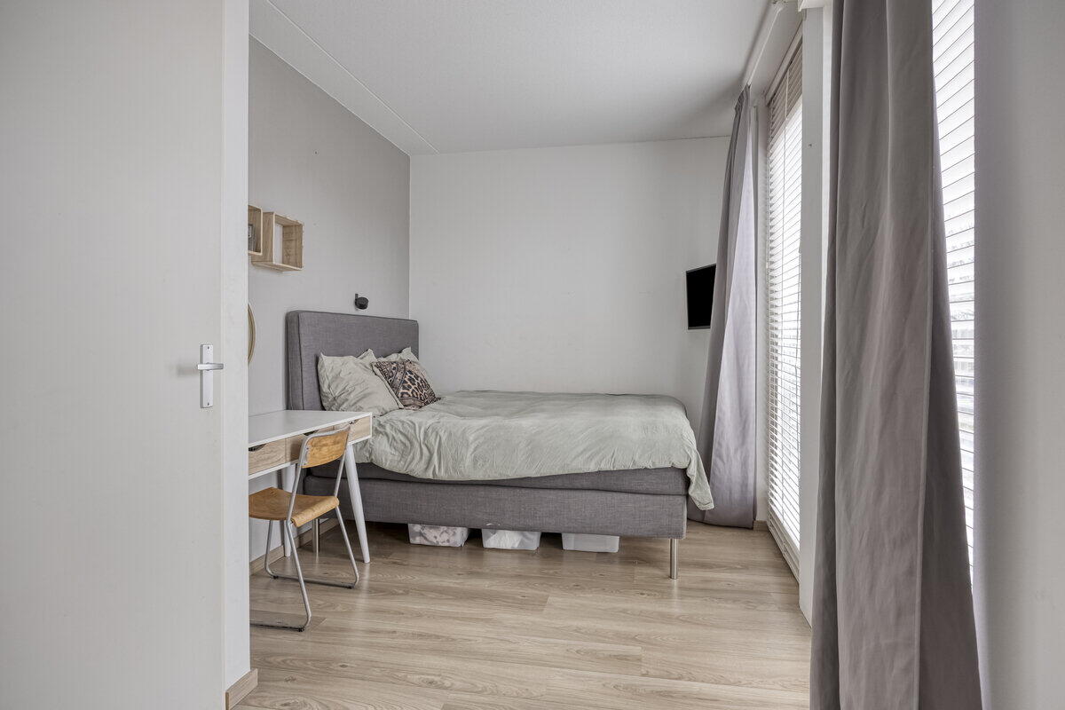 - een tweede slaapkamer met fraaie raampartijen tot aan de vloer en een openslaande kiep-/kanteldeur naar een Frans balkon.