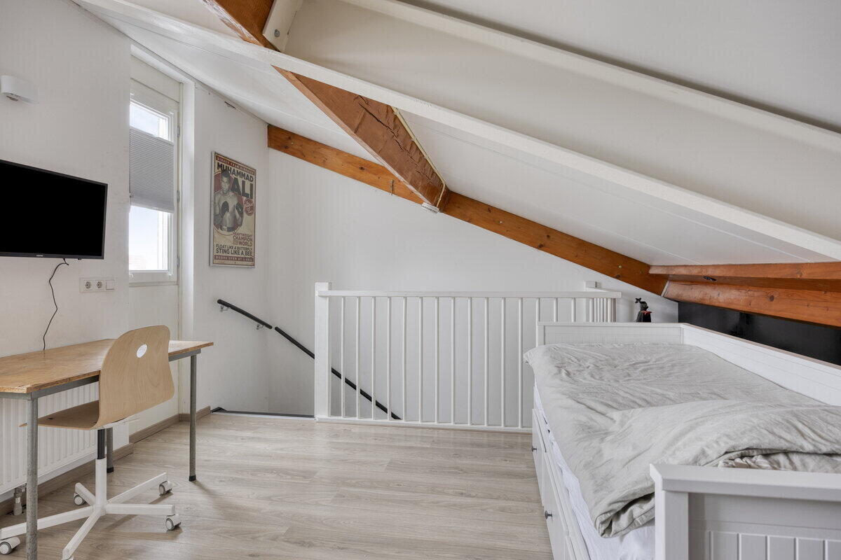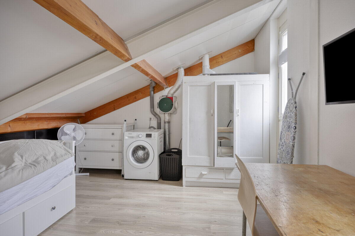 Via een vaste trap bereik je de volwaardige zolderverdieping met laminaatvloer, twee zijramen en een praktisch werkblad met spoelbak. Daarnaast zijn hier diverse bergkasten aanwezig en de aansluitingen voor wasmachine en droger.