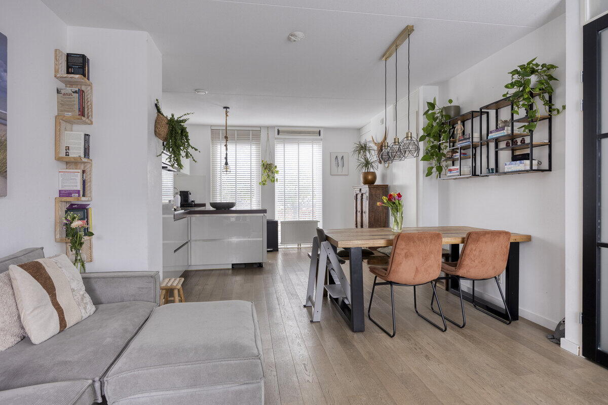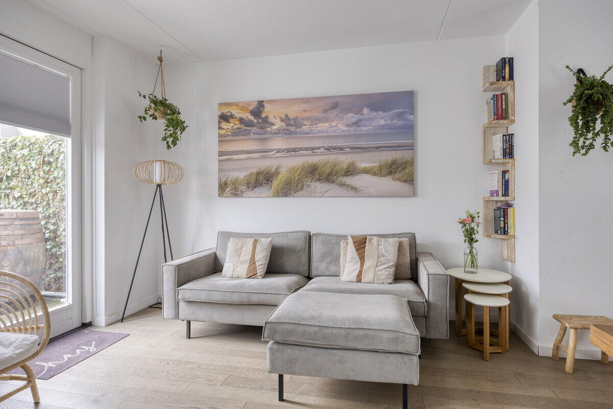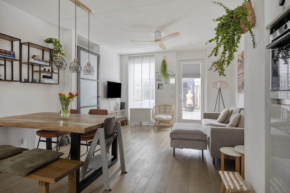 De moderne en lichte living is afgewerkt met een tijdloze houten vloer, strakke stucwerk wanden en een strak afgewerkt stucwerk plafond. Vanuit de woonkamer is er toegang tot het terras en de achtertuin.